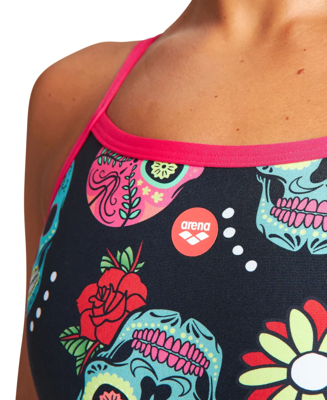 Our Crazy Skulls Carnival One-piece is designed for competitive training and intensive swimming. Its vibrant palette and wild motif of flowers and sugar skulls are inspired by the Day of the Dead. Match your cap and goggles to one of the print's colours.